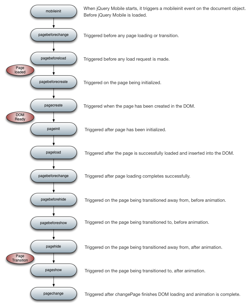 I was working on pages in jQuery Mobile today, and had to visualize the page event workflow. I drew up this diagram quickly in OmniGraffle. I think it might be of use for anyone looking to develop for jQuery Mobile. Its also available as a vector PDF below.